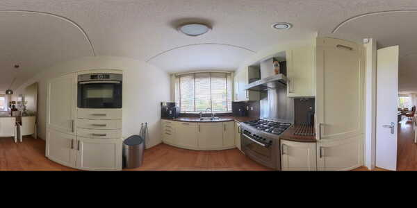 De keuken (ca. 8 m²) ligt aan de voorzijde van de woning en biedt vrij uitzicht door de straat. De keuken is uitgevoerd in een lichte kleurstelling en opgesteld in een praktische hoekopstelling. Tot de inbouwapparatuur behoren onder meer een 6-pits gasfornuis met brede oven en grill, een RVS afzuigkap, koel-vriescombinatie en vaatwasser. Daarnaast is er een vrijstaande dubbele kast aanwezig met een combi-oven.