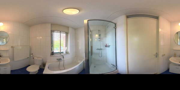De nette badkamer (ca. 5 m²) is geheel betegeld in een frisse wit-blauwe kleurstelling en beschikt over een ligbad, aparte douchecabine, tweede toilet (duoblok) en een vaste wastafel.