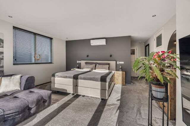 De master bedroom (ca. 26 m2) is een droom op zich. Deze royale kamer beschikt over openslaande deuren die direct toegang geven tot de prachtig aangelegde achtertuin. Dankzij de grote raampartijen geniet de kamer van een overvloed aan natuurlijk licht en een rustgevend uitzicht op het groen. Deze slaapkamer is afgewerkt met airconditioningsysteem, elektrisch bedienbaar rolluik, horren, vloerbedekking met vloerverwarming en sfeerverlichting.