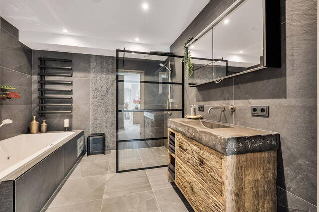 Aangrenzende badkamer (ca. 10 m2) met luxe sanitaire voorzieningen zoals wastafel met wastafelmeubel, spiegel met spiegelkast en verlichting, hangend toilet, designradiator, whirlpool met verlichting en massagejets, en een inloopdouche met regendouche. De badkamer is verder geheel betegeld en afgewerkt met spotjes, tegelvloer met vloerverwarming en geluidsinstallatie.