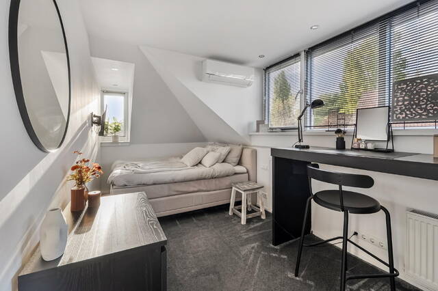 Slaapkamer 4 (ca. 9 m2) is gelegen aan de achterzijde van de woning en is voorzien van een 2-deuren vaste kast, bergruimte achter het knieschot, airconditioningsysteem, een kunststof dakkapel aan de zijkant van de woning en spotjes.