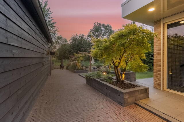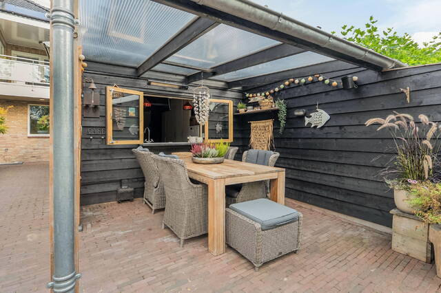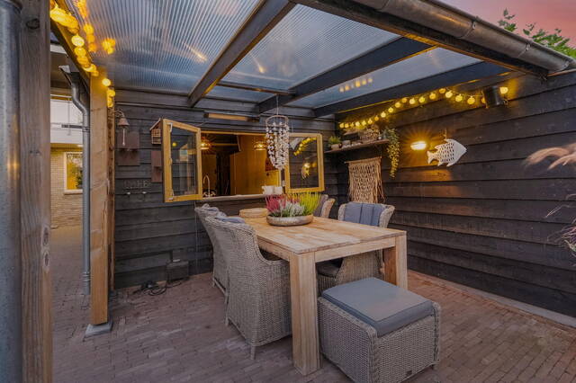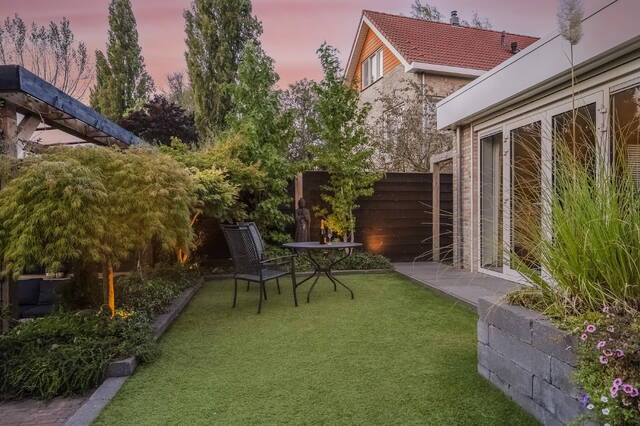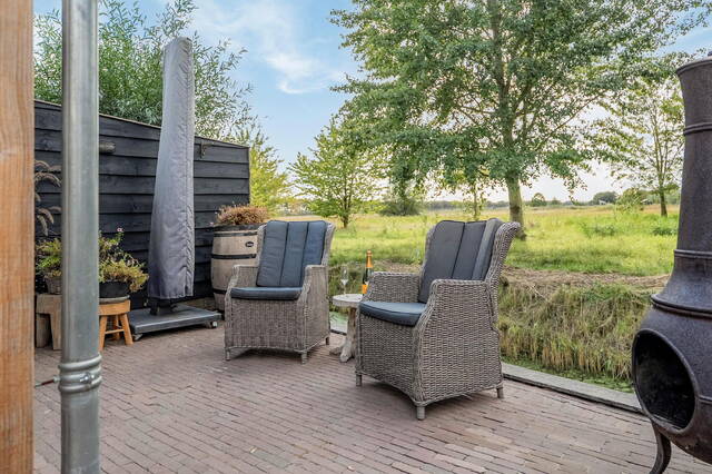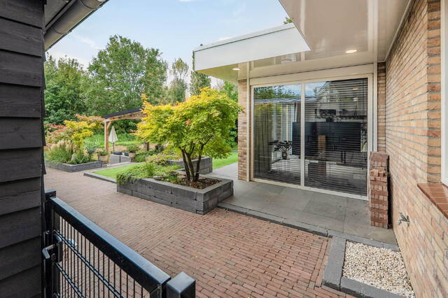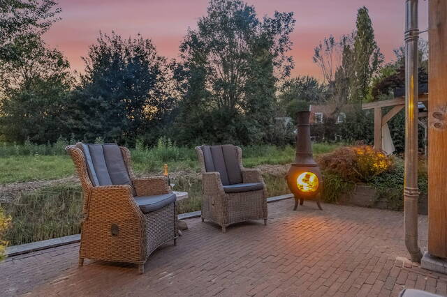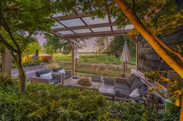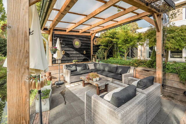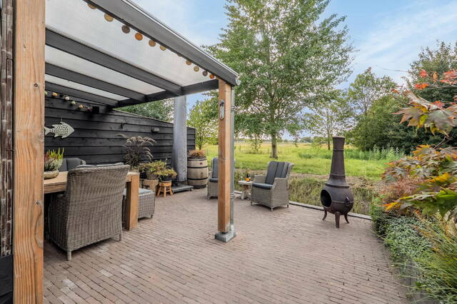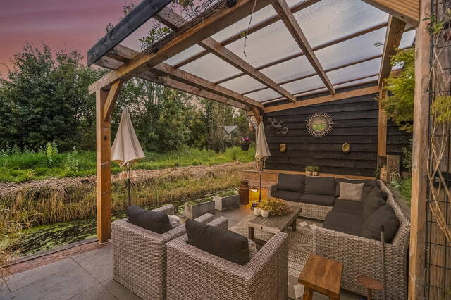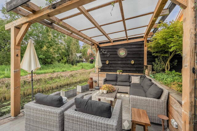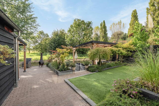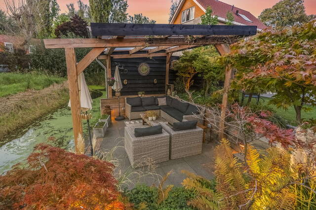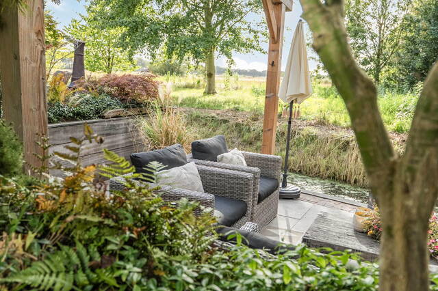 De achtertuin grenst aan het water en vanaf de tuin kijkt u uit over een uniek landschap waar talloze vogelsoorten hun thuis hebben gevonden, van zangvogels tot watervogels. Tussen het riet en de oevers leven bijzondere planten en kleine dieren die dit gebied extra karakter geven. In elk seizoen biedt de natuur een nieuw schouwspel – van bloeiende flora in de lente tot het zachte gefluit van vogels in de vroege ochtend. Deze prachtige achtertuin ligt op het zuiden en beschikt verder over een sproeisysteem, sfeerverlichting, kunstgras, sierbeplanting, verschillende terrassen, waterkraan, stopcontacten en een tweede overkapping aan de waterkant.