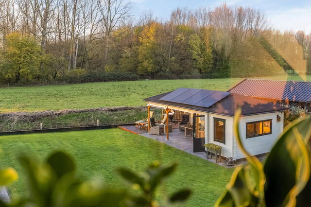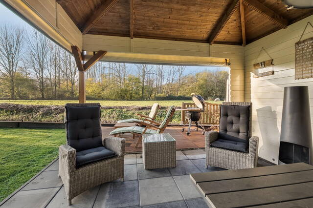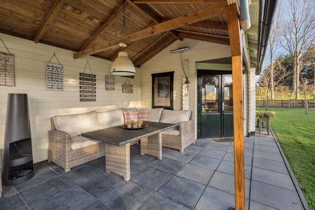 Overkapping (ca. 15 m2) voorzien van elektra, stopcontacten en een elektrische terrasverwarming.