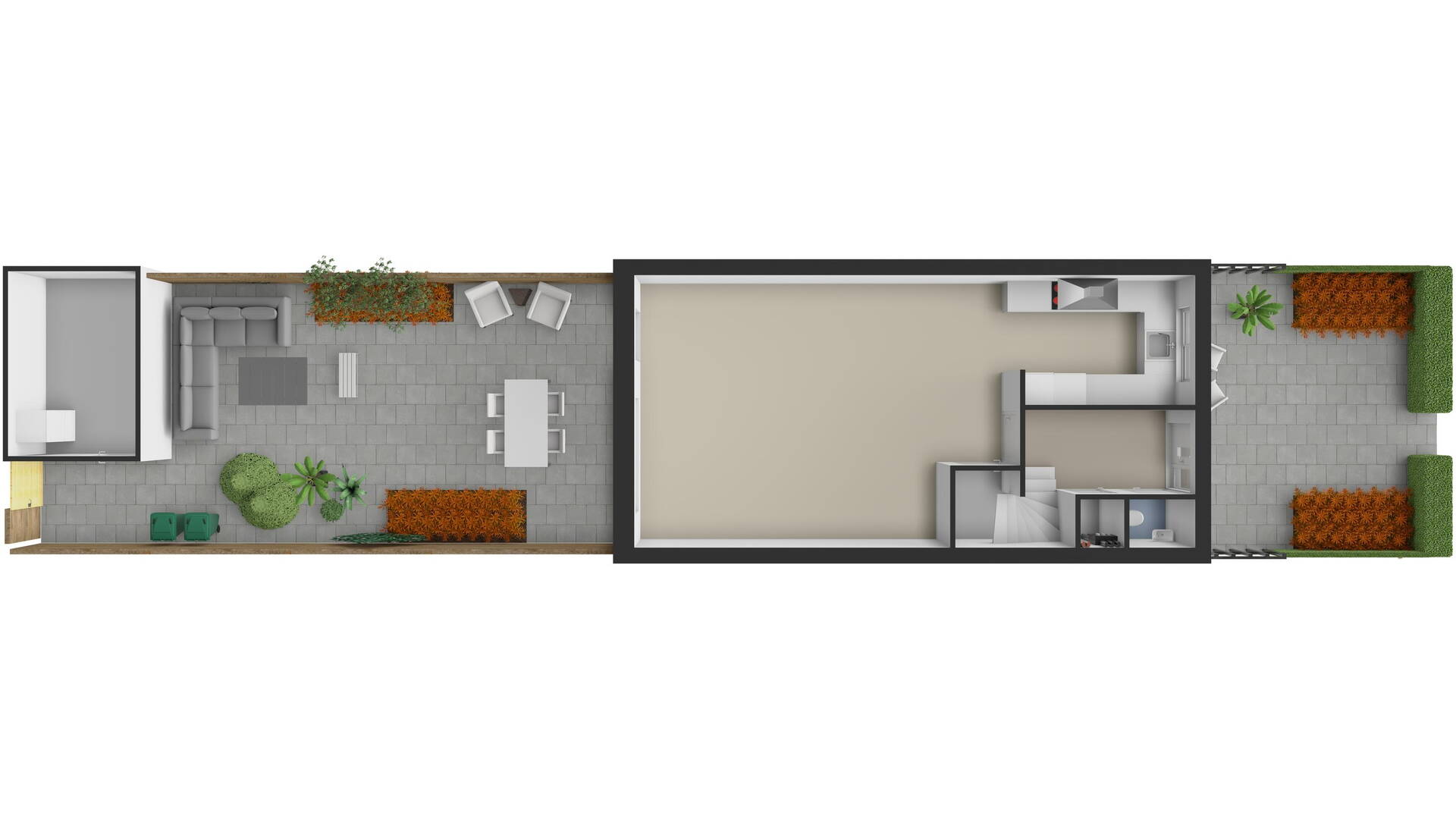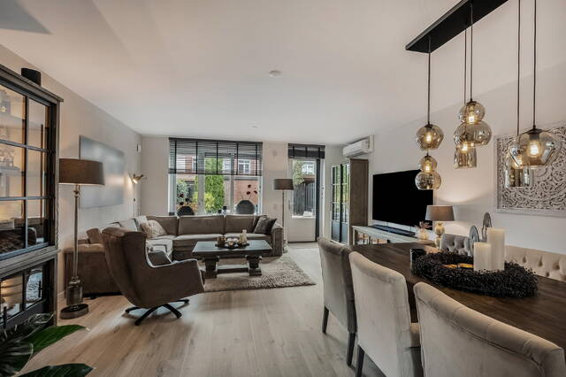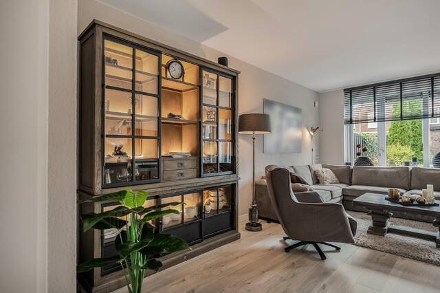 De tuingerichte woonkamer biedt een aangename leefruimte met toegang tot de achtertuin, die op het noordwesten is gelegen. De tuin is sfeervol aangelegd met sierbestrating, diverse groene borders en meerdere terrassen voor een fijne zitplek op elk moment van de dag. Achterin staat een stenen berging en aan de woning bevindt zich een elektrisch bedienbaar zonnescherm.
