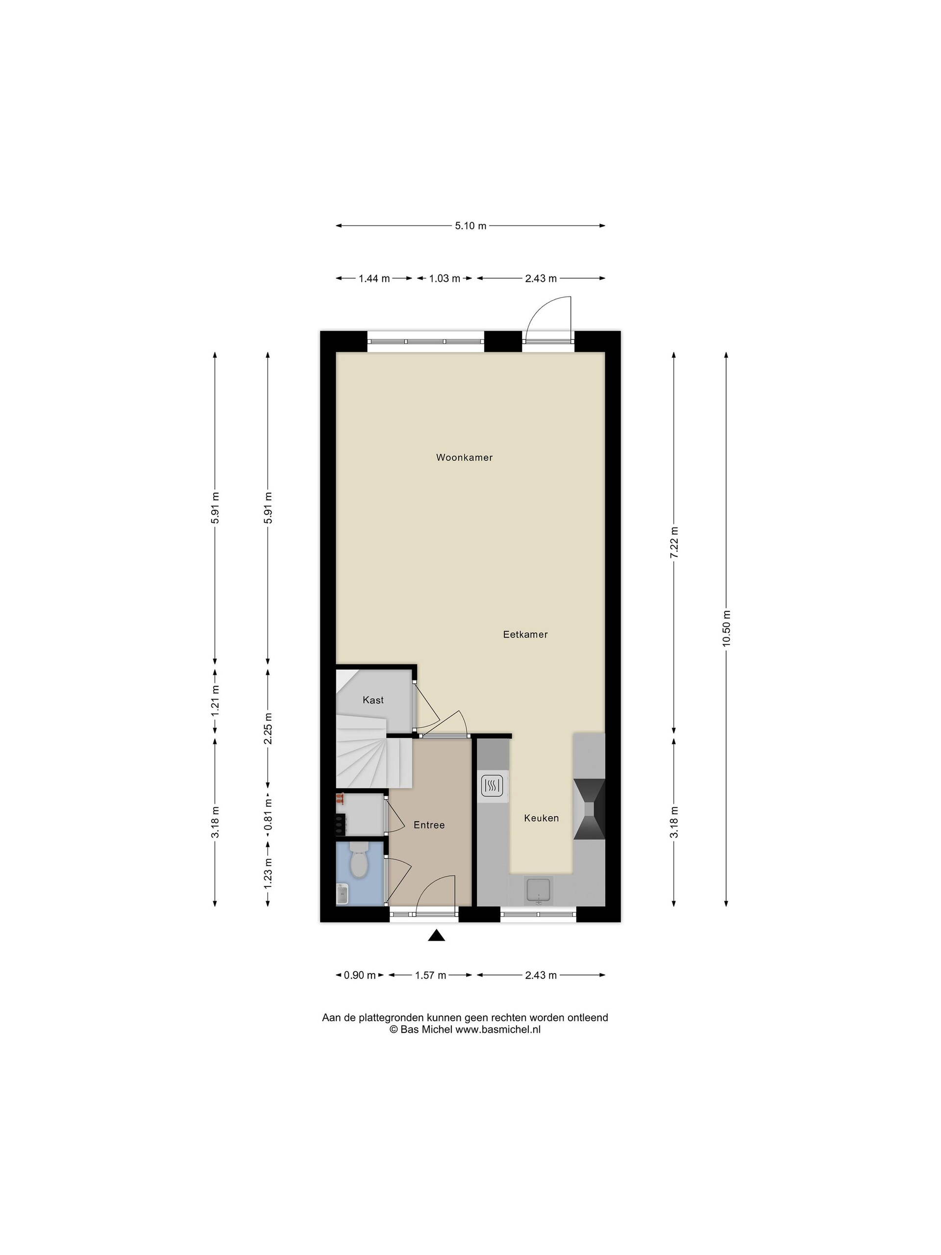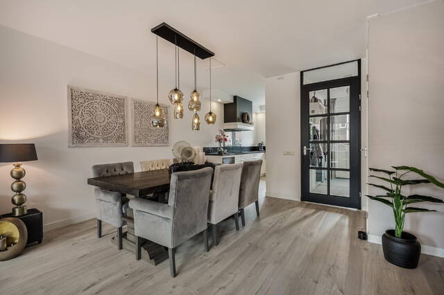 Aansluitend betreedt u de woonkamer via een stijlvolle zwarte glazen paneeldeur. De gehele begane grond is voorzien van een sfeervolle laminaatvloer en strak gestucte wanden en plafonds, wat zorgt voor een moderne en frisse uitstraling.