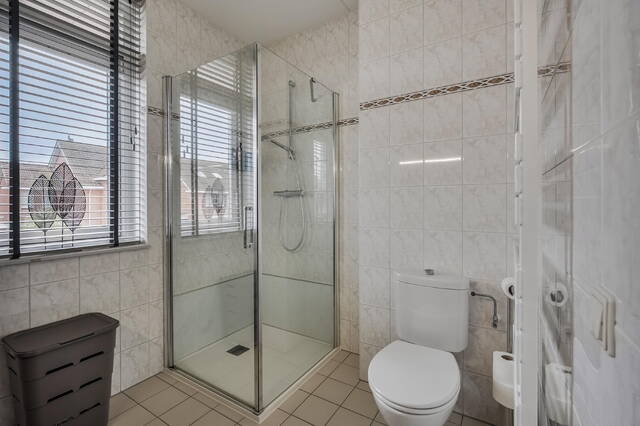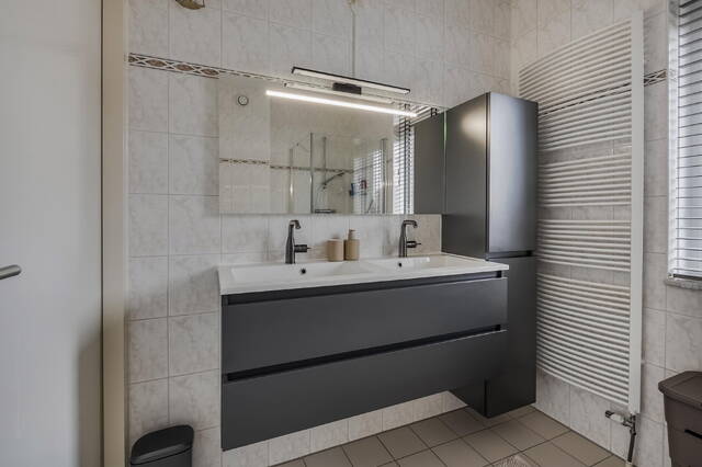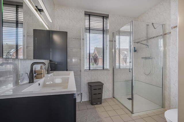 De badkamer is in 2023 gedeeltelijk vernieuwd en is uitgerust met een moderne inloopdouchecabine, een nieuw dubbel wastafelmeubel met spiegel en een tweede duobloktoilet. De lichte betegeling zorgt voor een frisse en tijdloze uitstraling.