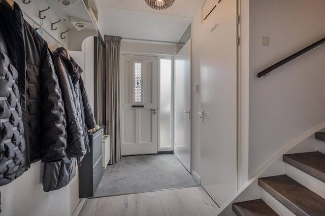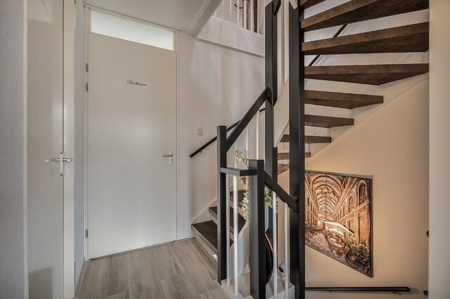 De eerste verdieping bereikt u via een trap met stijlvolle laminaat trapbekleding.