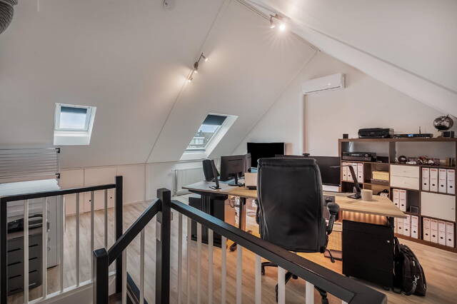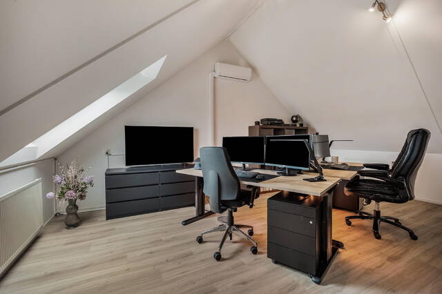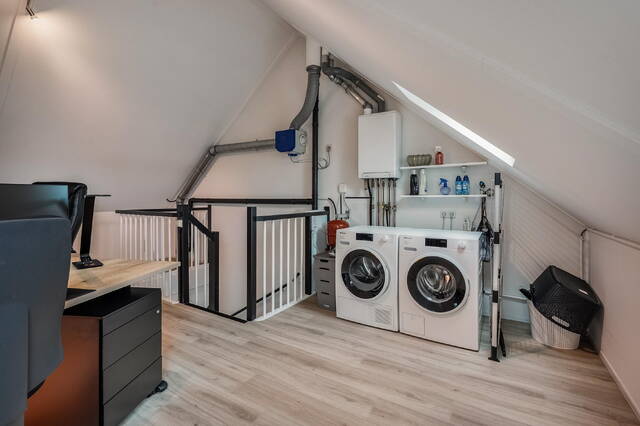 De open zolderverdieping is een veelzijdige ruimte met hoge kwaliteit linoleumvloer en airconditioning. Hier zijn eenvoudig één of twee extra slaapkamers te realiseren. Daarnaast vindt u er de wasmachine- en drogeraansluiting, de opstelling van de CV-ketel, mechanische ventilatie en de omvormer van de 12 zonnepanelen (geplaatst in 2023).