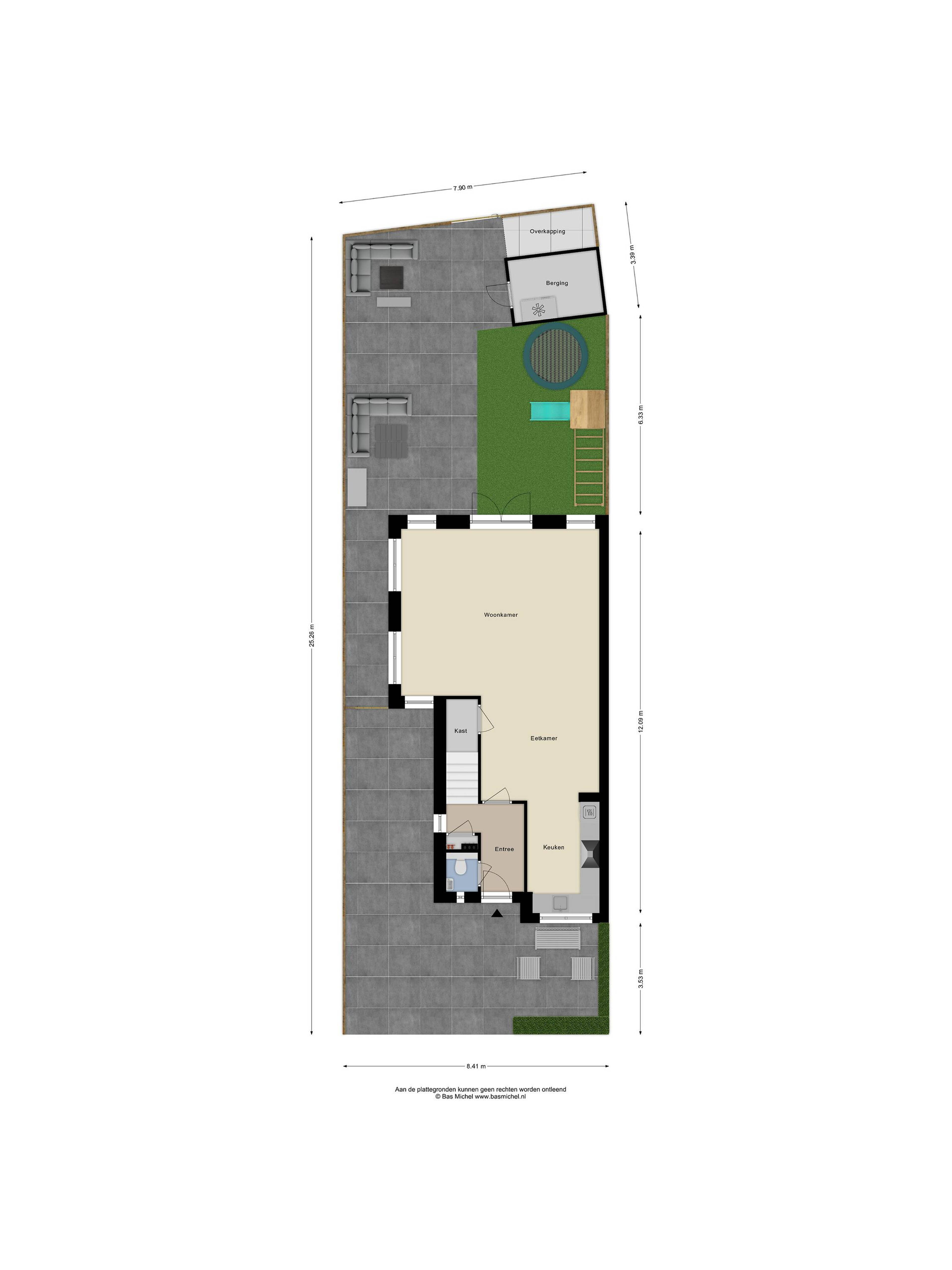 Je parkeert op eigen oprit en loopt via de verzorgde voortuin naar de voordeur. De voortuin is ruim van opzet en doordat deze in de middag gunstig op de zon ligt, is dit een fijne plek om buiten te zitten. In de hal vinden we de meterkast, de toiletruimte met hangcloset en de trap naar de eerste verdieping, subtiel voorzien van ledverlichting.