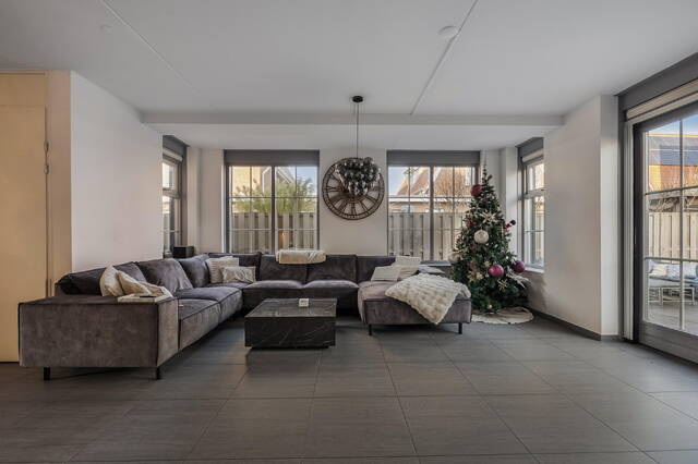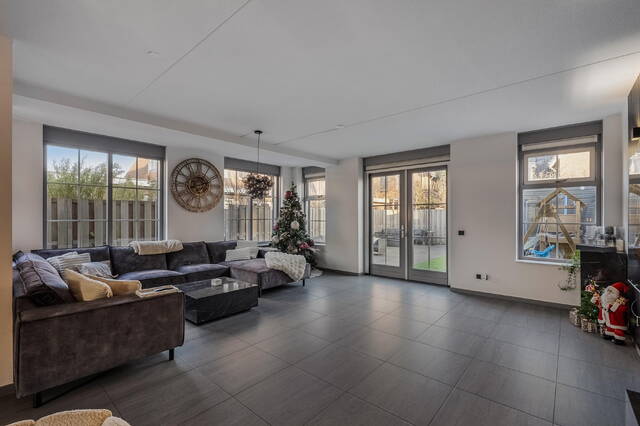We lopen door naar de woonkamer. Wat direct opvalt, is het licht en de ruimte. Door de uitbouw aan zowel de zij- als achterzijde is hier een royale leefruimte ontstaan. De openslaande deuren verbinden de woonkamer prettig met de tuin.