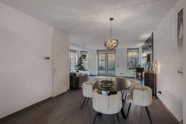 De gehele begane grond is voorzien van een lichte plavuizen vloer met vloerverwarming. Wanden en plafonds zijn strak gestukt en de praktische trapkast zorgt voor extra opbergruimte.