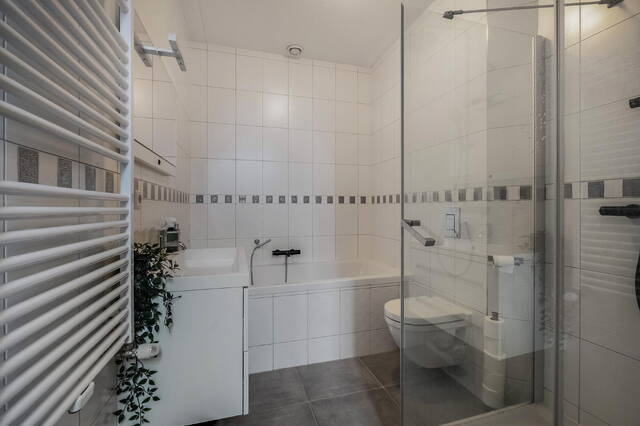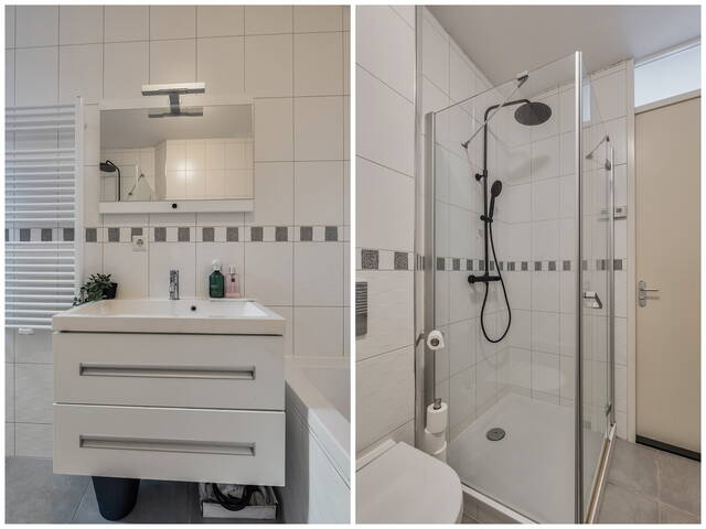De badkamer is modern en volledig betegeld en beschikt over een wastafelmeubel, douchecabine, ligbad en toilet. Alles wat je nodig hebt, netjes en verzorgd.