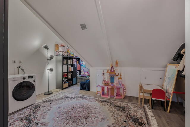 Aan de voorzijde ligt de was-/stookruimte. Deze is praktisch ingericht met aansluitingen voor wasmachine en droger en de opstelplaats van de CV-ketel (2009). Deze ruimte biedt bovendien de mogelijkheid om een vijfde slaapkamer te realiseren of, zoals nu, te gebruiken als speelkamer voor de kinderen.