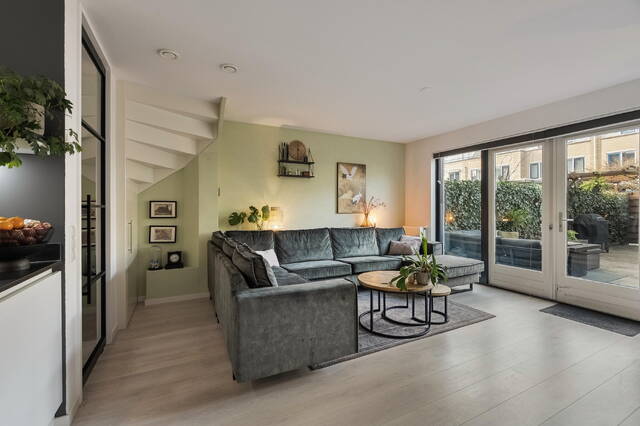 De woonkamer is bereikbaar via een fraaie zwart stalen taatsdeur en voelt direct licht en uitnodigend aan dankzij de grote raampartijen en de openslaande deuren naar de achtertuin. De laminaatvloer zorgt voor een warme en moderne uitstraling. Daarnaast beschikt de woonkamer over een handige bergruimte onder de trap.