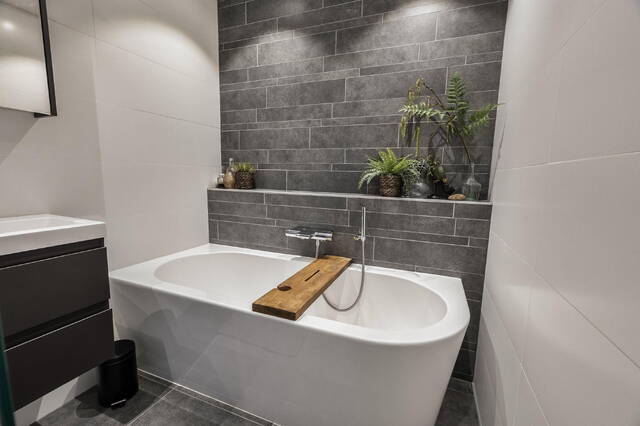 De moderne badkamer is compleet ingericht met een half vrijstaand ligbad, een inloopdouche cabine, een wastafelmeubel met spiegelkast en dimbare spotverlichting in het plafond. De gehele verdieping is afgewerkt met een sfeervolle laminaatvloer.