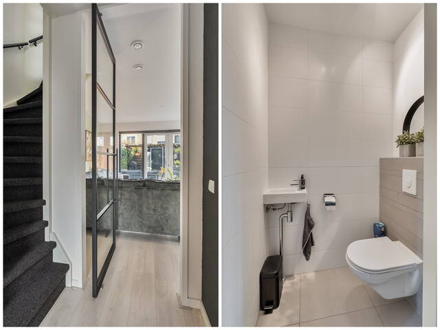 Via de sfeervolle voortuin betreedt u de woning. De ruime hal is praktisch ingericht met schuifkasten voor de meterkast en garderobe. De toiletruimte is modern afgewerkt met een hangend toilet en fonteintje, volledig betegeld in een stijlvolle wit/grijze kleurstelling.