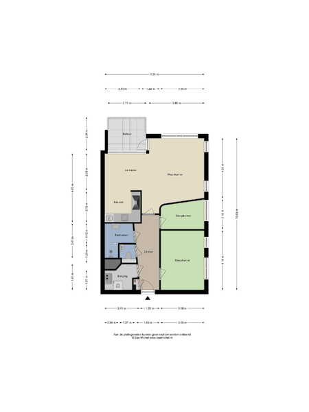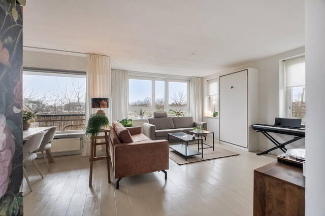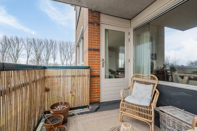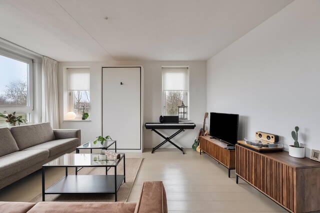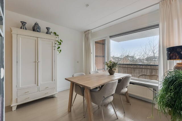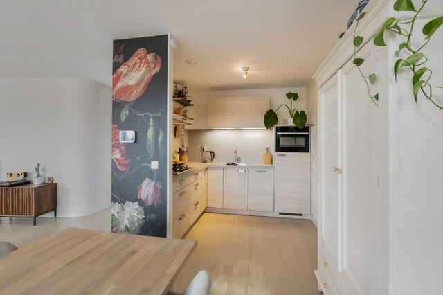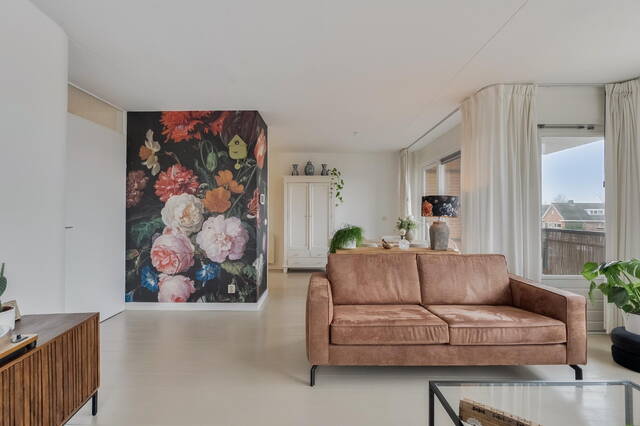 Via de ruime hal zijn alle vertrekken toegankelijk. De lichte woonkamer vormt het hart van het appartement en is afgewerkt met een houten vloer, wat zorgt voor een warme en moderne uitstraling. Grote raampartijen en de hoekligging dragen bij aan de prettige lichtinval. Vanuit de woonkamer bereikt u middels een loopdeur het balkon op het noordwesten, waar u kunt genieten van een vrij en open uitzicht en de middag- en avondzon.