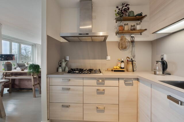 De open keuken is uitgevoerd in een praktische L-opstelling en uitgevoerd in lichte kleuren. De keuken is voorzien van diverse inbouwapparatuur, waaronder een 5-pits gaskookplaat, RVS afzuigkap, koelkast, smalle vaatwasser, enkele spoelbak en een combi-magnetron. Het kunststof aanrechtblad maakt het geheel onderhoudsvriendelijk en strak.