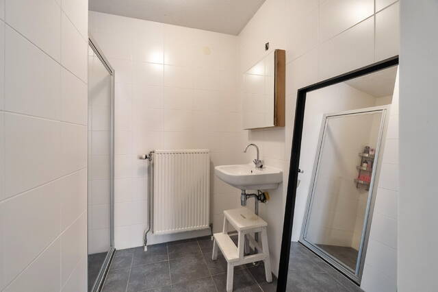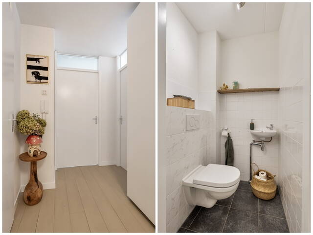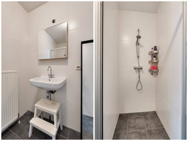 De moderne badkamer is uitgevoerd in een frisse wit/grijze kleurstelling en voorzien van een vaste wastafel met spiegelkast en een aparte inloopdouchecabine. De separate toiletruimte beschikt over een hangend toilet en een fonteintje, eveneens uitgevoerd in lichte, tijdloze kleuren.