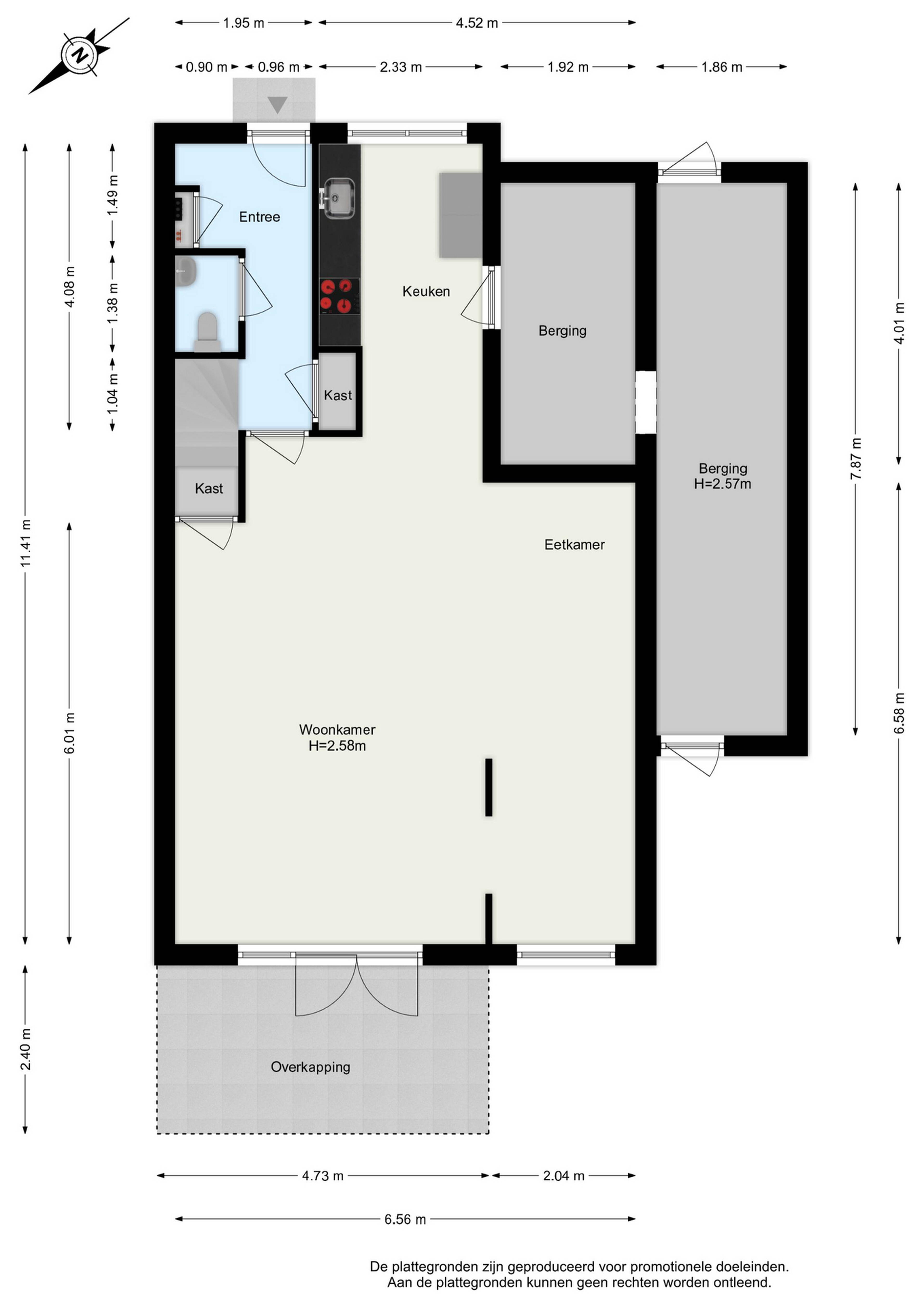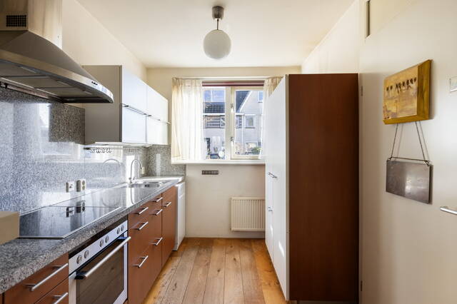 Aan de voorzijde bevindt zich de open keuken. Deze is praktisch ingedeeld en voorzien van een RVS-afzuigkap, een keramische kookplaat met vier zones, een oven, koelkast, vaatwasser en een granieten aanrechtblad. Het donkere werkblad vormt een mooi contrast met de kastfronten en biedt volop werkruimte. Vanuit de keuken is er toegang tot de berging. Deze berging is geplaatst tussen de woning en de naastgelegen woning. Voorheen was dit een schuur met een deur aan zowel de voor- als achterzijde. Tegenwoordig biedt deze ruimte praktische opslagmogelijkheden en een handige verbinding tussen voor- en achterzijde.