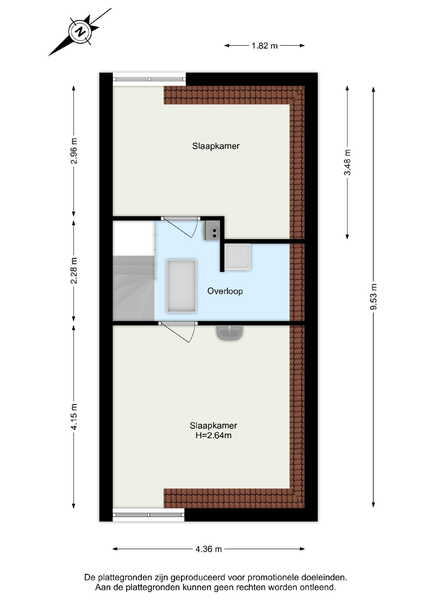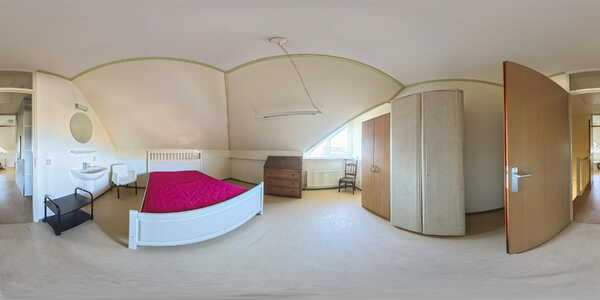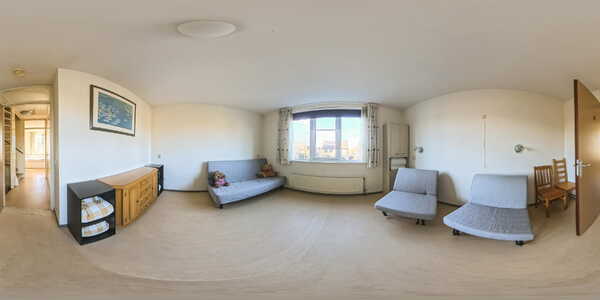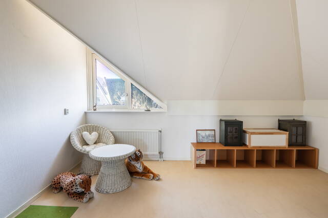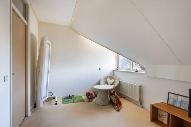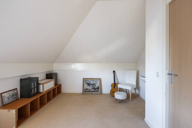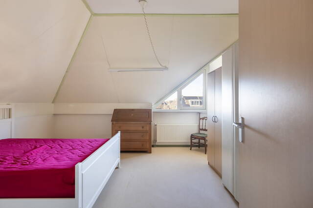 De tweede slaapkamer, gelegen aan de achterzijde, is eveneens ruim van opzet. Dankzij de schuine kap en de slimme indeling ontstaat hier een sfeervolle en prettige ruimte met voldoende plaats voor een bed en aanvullende kasten of een bureau.