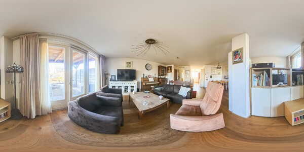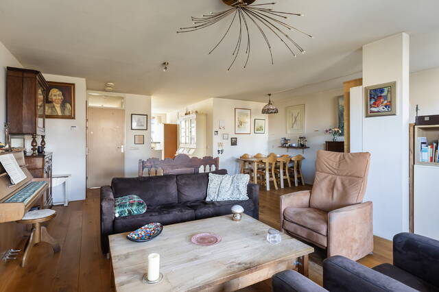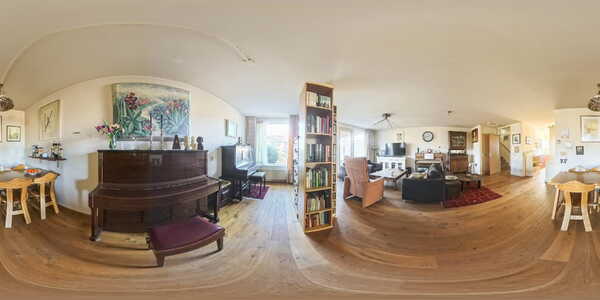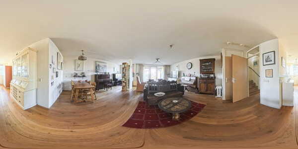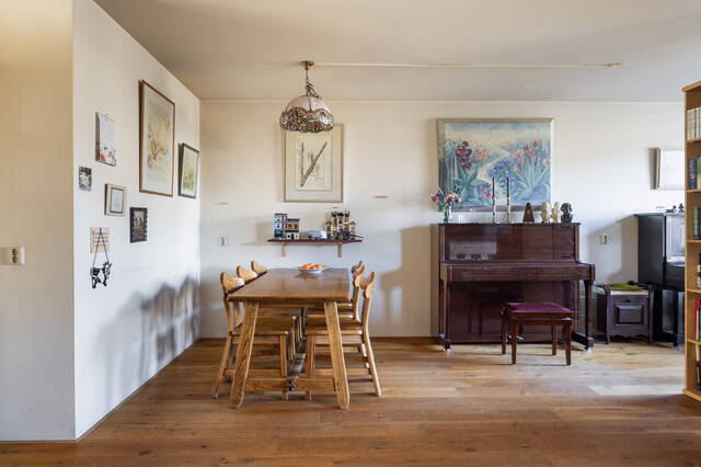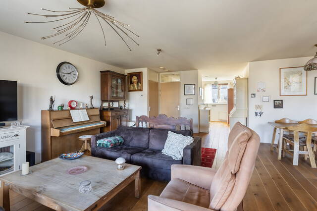 De woonkamer is royaal opgezet en strekt zich uit over de volledige diepte van de woning. Wat hier meteen opvalt is de ruimte en het licht. Dankzij de grote raampartijen aan de achterzijde valt het daglicht rijkelijk naar binnen en ontstaat er een fijne, open leefruimte. Er is meer dan voldoende plek voor een grote zithoek én een royale eettafel, zonder dat het geheel vol aanvoelt. De warme houten vloer en de rustige wandafwerking zorgen voor een huiselijke en sfeervolle basis.