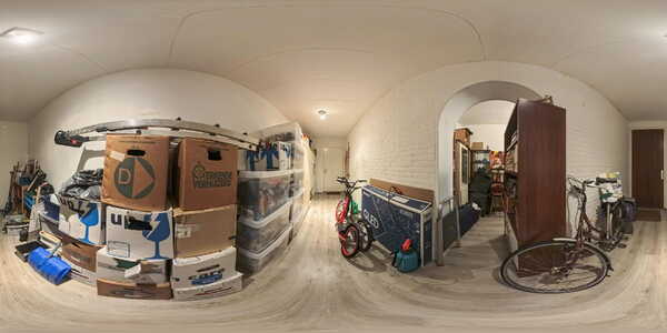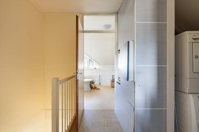 De overloop is praktisch ingericht en hier bevinden zich de aansluitingen voor de wasmachine en droger, evenals de opstelling van de cv-ketel. Alles is netjes opgesteld en functioneel ingedeeld, waardoor deze verdieping niet alleen extra woonruimte maar ook praktische bergruimte biedt.