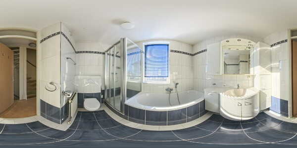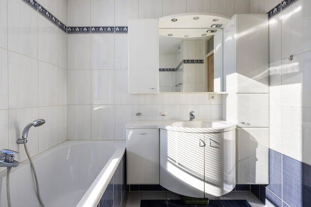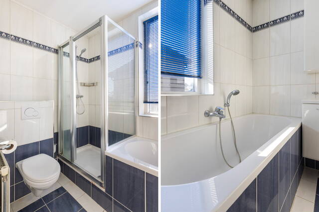 De badkamer is volledig betegeld en compleet uitgevoerd. Hier vindt u een ligbad, een separate douchecabine, een wastafelmeubel met bergruimte en een toilet. Dankzij het aanwezige raam komt er natuurlijk licht binnen en kan de ruimte prettig worden geventileerd. De combinatie van bad en douche maakt de badkamer comfortabel en geschikt voor het hele gezin.