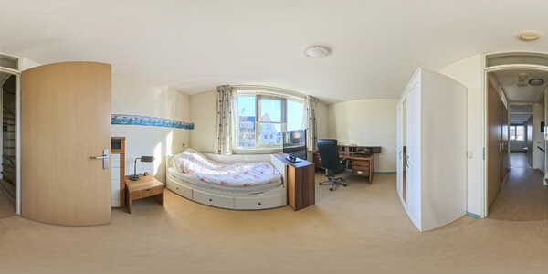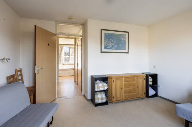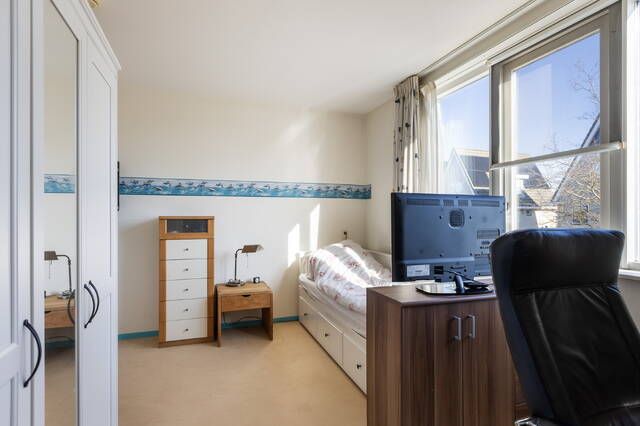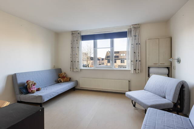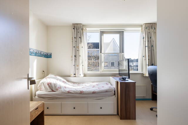 Aan de voorzijde ligt de tweede slaapkamer. Ook deze kamer beschikt over een groot raam, waardoor er aangenaam daglicht binnenvalt. De ruimte is goed van formaat en leent zich uitstekend als slaapkamer, kinderkamer of logeerkamer. Door de rechte wanden is de indeling praktisch en eenvoudig naar wens in te richten. Deze slaapkamer beschikt bovendien over een eigen wastafel.