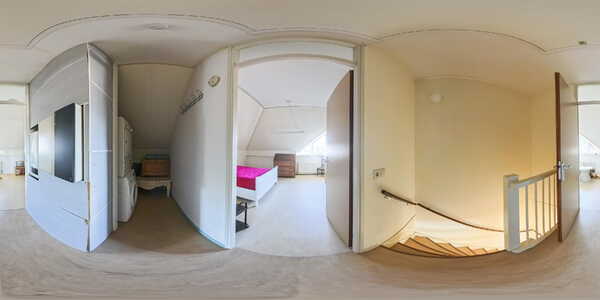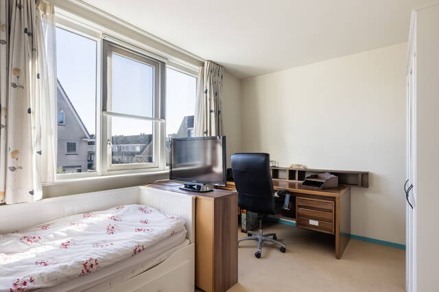 Aan de voorzijde bevindt zich een slaapkamer met een speelse kapconstructie. Deze kamer is uitstekend geschikt als kinder-, werk- of logeerkamer.
