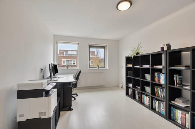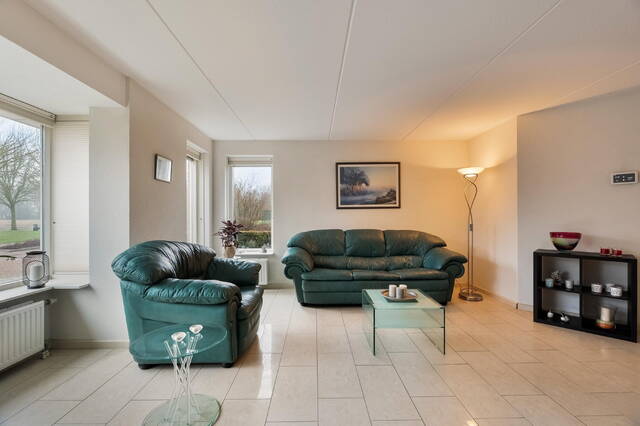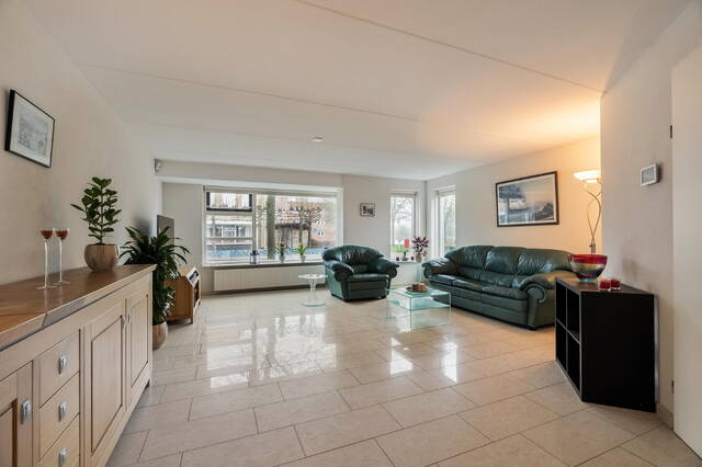 De royale, lichte woonkamer is gelegen aan de voorzijde van de woning. Deze degelijke woning is gebouwd met klassieke stijl kenmerken zoals een sfeervolle erker met grote glazen ramen. Door de erker biedt de woonkamer een mooie lichtinval die van verschillende zijden binnenvalt en de kamer ruimer en eleganter maakt. De erker nodigt uit tot een knusse zithoek/leeshoek. De woonkamer is verder afgewerkt met tegelvloer met vloerverwarming wat zorgt voor een aangenaam binnenklimaat en meer vrijheid in uw inrichting.