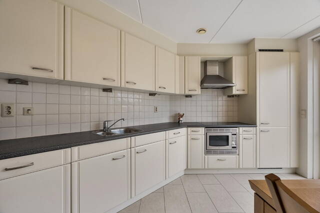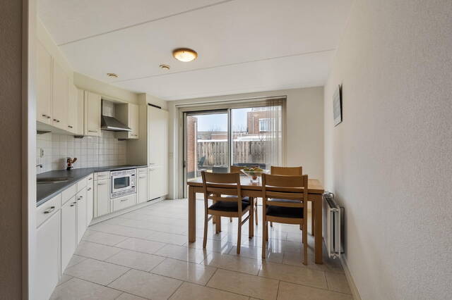 De tuingerichte keuken is uitgevoerd in een L-opstelling en is voorzien van diverse inbouwapparatuur zoals koelkast, vrieskast, inductiekookplaat, RVS afzuigkap, magnetron, close-in boiler en een vaatwasser. Verder is de keuken voorzien van anderhalve spoelbak. Het geheel is uitgevoerd in lichte kleuren en afgewerkt met een kunststof aanrechtblad, wandtegels, sfeerverlichting en tegelvloer met vloerverwarming. Middels de schuifpui heeft u toegang tot de achtertuin.