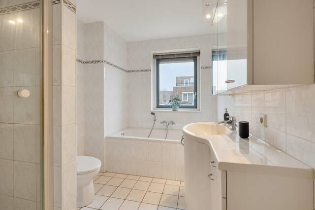 De badkamer (ca. 7 m2) beschikt over sanitaire voorzieningen zoals een wastafel met wandmeubel, spiegel met spiegelkast en verlichting, ligbad, een duoblok toilet, douchecabine en designradiator. De badkamer is geheel betegeld en afgewerkt met vloerverwarming.