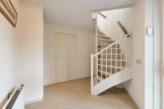 Ruime overloop met trap naar de 2e verdieping, een bergkast en toegang tot alle vertrekken. De overloop is afgewerkt met laminaatvloer.