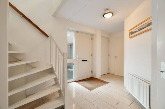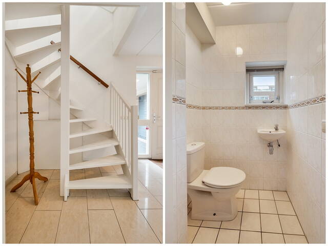 Overdekte entree met verlichting, ruime hal met meterkast, trap naar de 1e verdieping, toiletruimte voorzien van een duoblok en fonteintje. De toiletruimte is geheel betegeld in een beige kleurstelling. Via de hal heeft u toegang tot de inpandige garage.