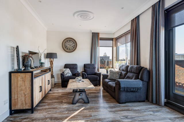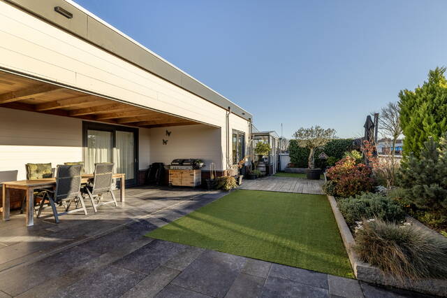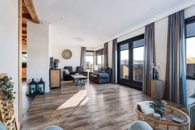 De bovengelegen woning – gebouwd in 2019 – is een luxe appartement met een hoogwaardige afwerking, veel leefruimte, een zonnig dakterras en duurzame installaties zoals 50 zonnepanelen en warmtepompen. Een eigen entree zorgt ervoor dat de woning volledig zelfstandig te gebruiken is, eventueel te verhuren of ideaal voor wonen boven het eigen bedrijf.