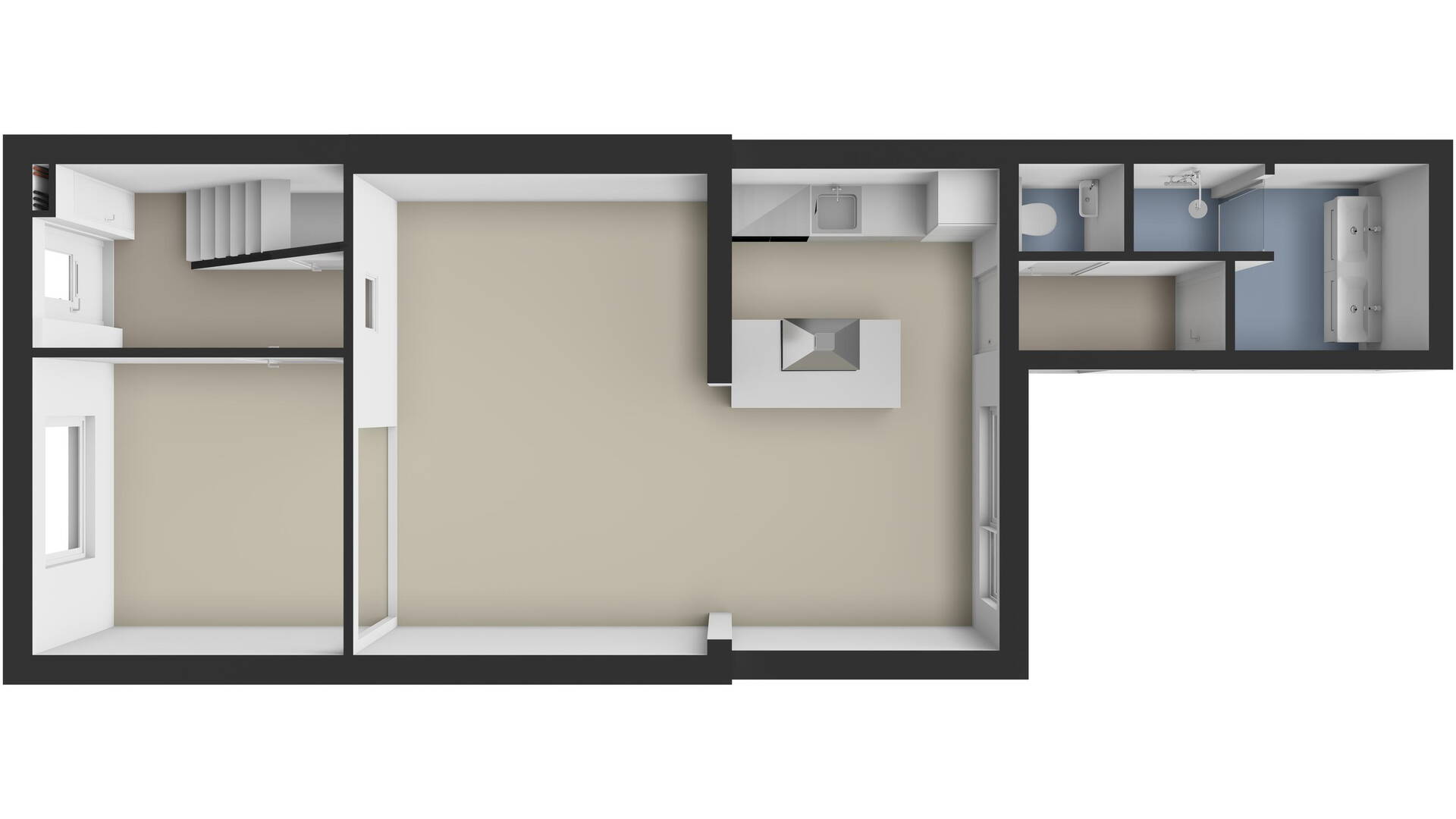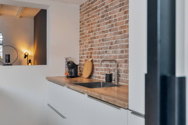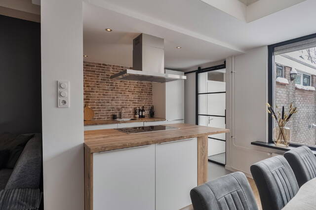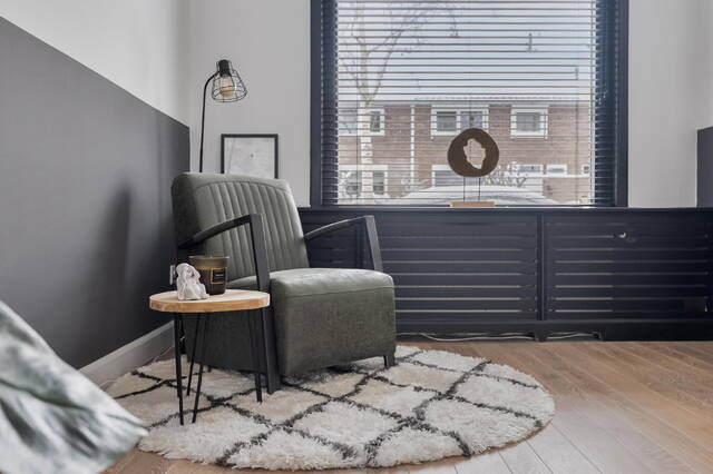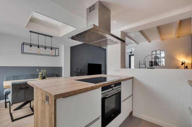 Er is een aparte living gecreëerd die in (half)open verbinding staat met de keuken. De keuken (2020) is modern, voorzien van een praktisch kookeiland en voldoende kastruimte voor al je kookspullen en voorraad. Vanuit de keuken geeft de stoere zwarte schuifdeur toegang tot de hal, de aparte toiletruimte én de badkamer.