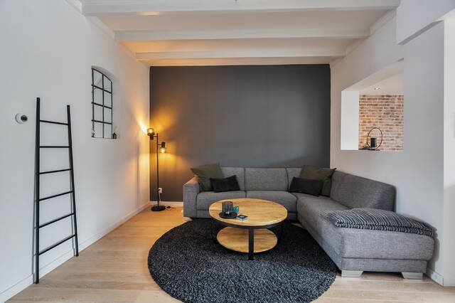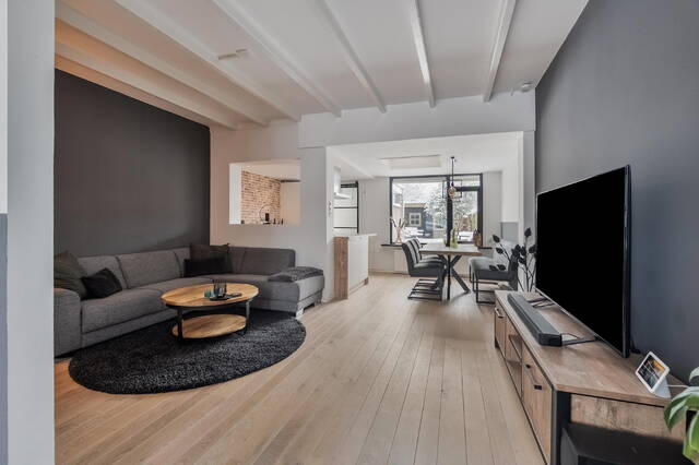 De woonkamer is aan de achterzijde uitgebouwd en beschikt over een lichtkoepel, waardoor het daglicht rijkelijk binnenvalt. De hoge plafonds met balken zorgen voor een bijzondere en knusse sfeer. In de voorkamer is een airconditioning aanwezig: heerlijk koel in de zomer, behaaglijk warm in de winter.