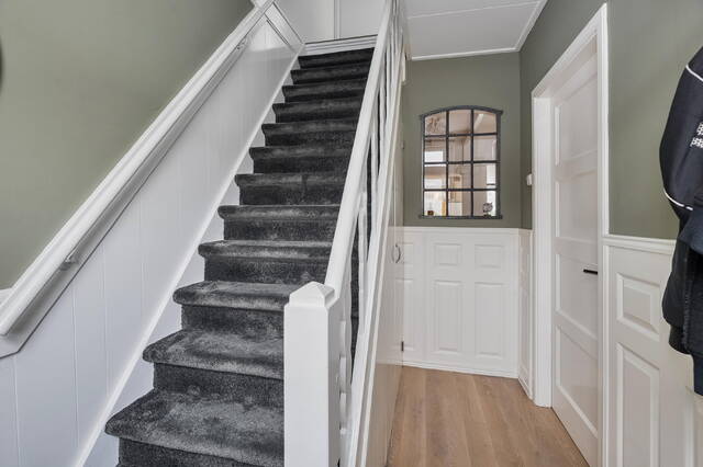 Via de verzorgde voortuin kom je binnen in de hal. Het glas-in-lood stalraam geeft direct een doorkijkje naar de woonkamer en zet meteen de toon: warm, karaktervol en uitnodigend.