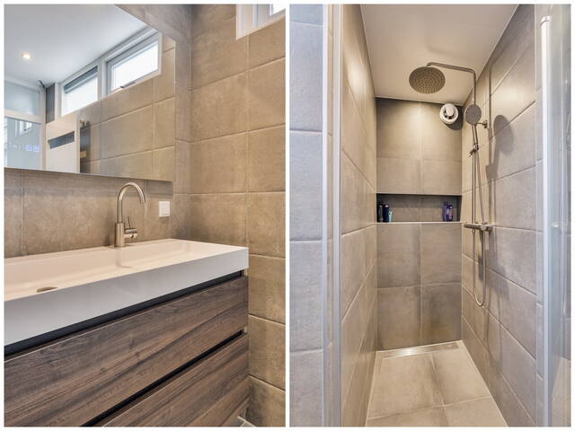De badkamer (2023) is strak en luxe afgewerkt met grijze tegels, inbouwspots, een inloopdouche met regendouche, een breed dubbel wastafelmeubel en een elektrische radiator. Alles bevindt zich op de begane grond - praktisch en comfortabel.