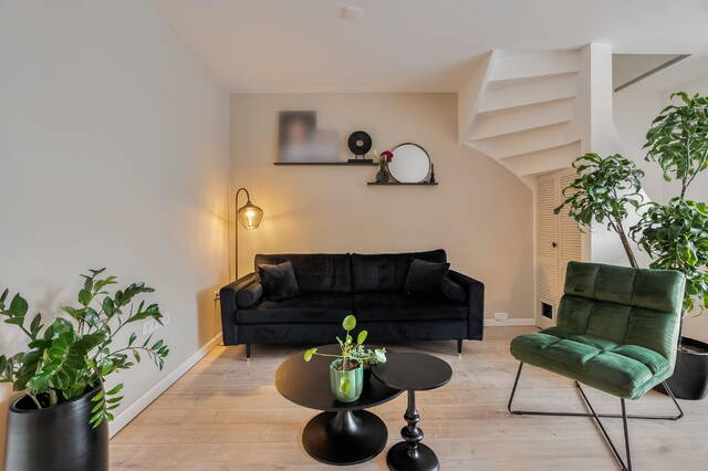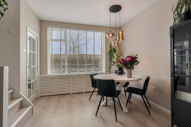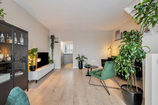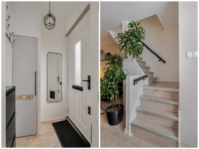 Via het voortuintje kom je binnen in een praktisch tochtportaal met de meterkast. Vanuit hier stap je de woning binnen in de lichte en gezellige woonkamer. Grote ramen zorgen voor veel daglicht, de laminaatvloer geeft een strakke basis en onder de trap bevindt zich een handige bergkast.