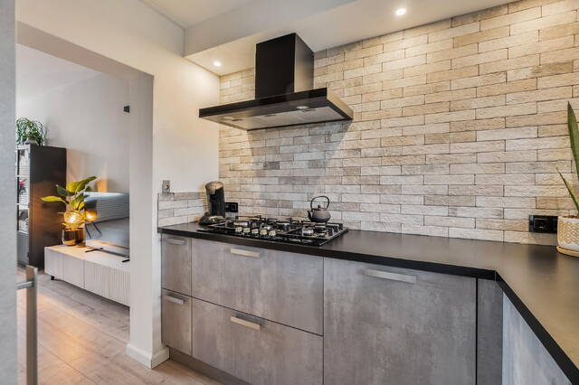 Aan de achterzijde van de woning ligt de open keuken, een echte eyecatcher. Uitgevoerd in antraciet met een donker aanrechtblad, strak maar warm tegelijk. Uiteraard is de keuken compleet uitgerust met een 5-pits gaskookplaat, schouw, 100°C-kraan, vaatwasser, combi-oven, koelkast en vrieskast. Terwijl je kookt, kijk je uit over de tuin — koken met een view.