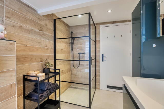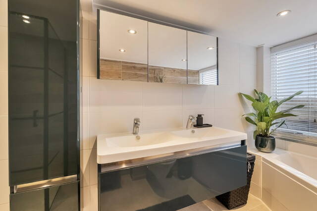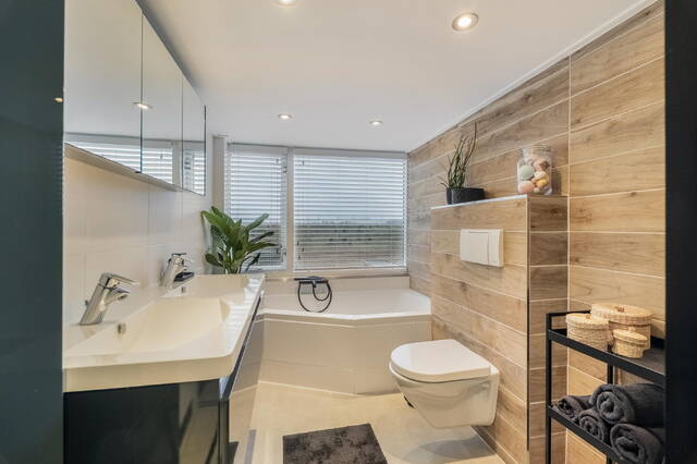 De badkamer is ruim en stijlvol uitgevoerd in natuurlijke tinten met wit sanitair. Je beschikt hier over een hoekbad, inloopdouche, tweede toilet en twee wastafels met meubel en spiegel. Het grote raam zorgt voor veel daglicht en natuurlijke ventilatie — fris, licht en comfortabel.