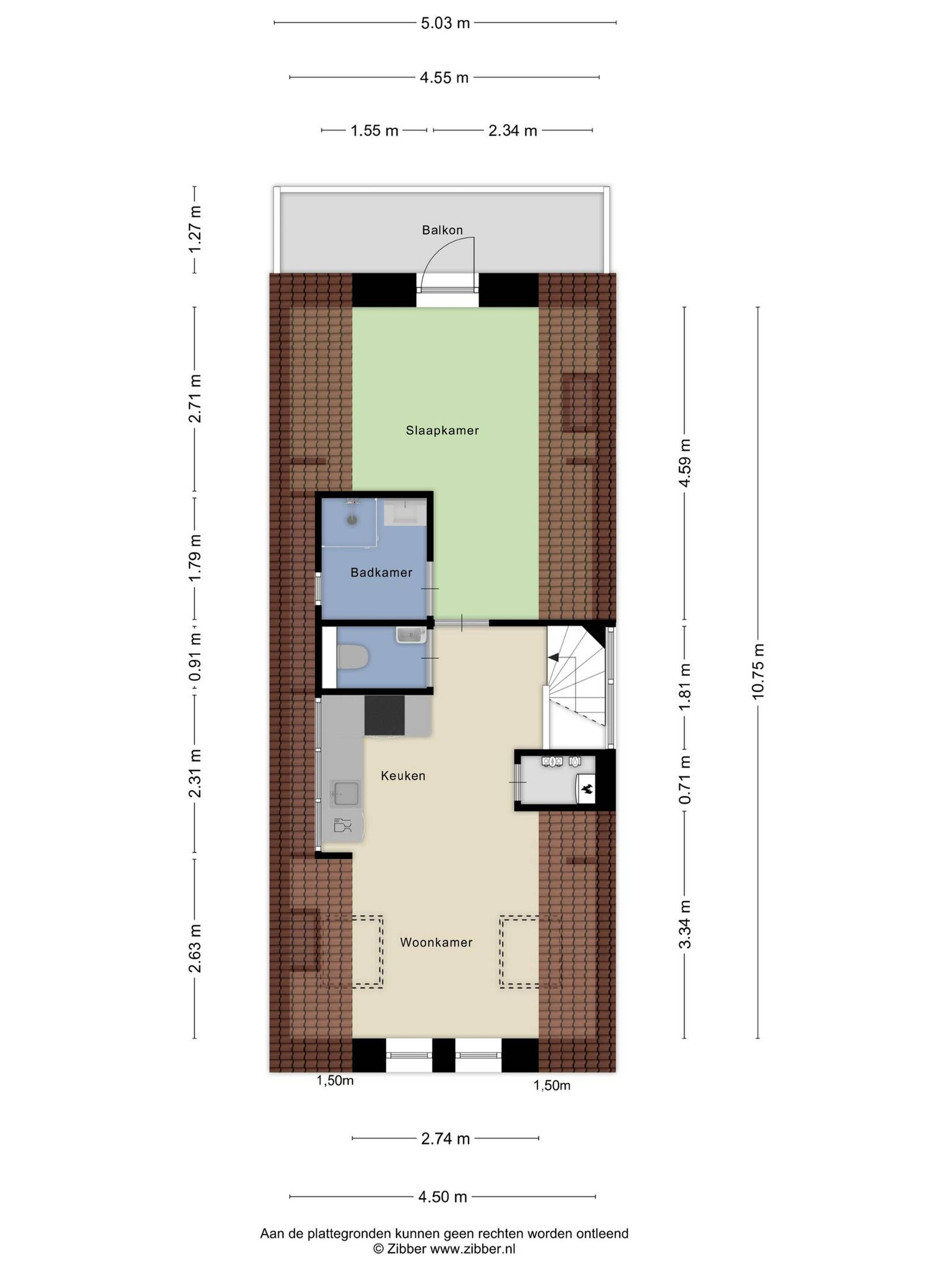 Via de gezamenlijke entree bereik je op de tweede verdieping je eigen voordeur. Achter de voordeur kom je binnen in een kleine hal waar je je jas kunt ophangen. Vervolgens loop je door naar de derde verdieping, waar je binnenkomt in de lichte en ruimtelijke woonkamer met open keuken. Dankzij de dakramen is het hier heerlijk licht. Het vloeroppervlak bedraagt circa 65 m², maar door de schuine kap mag alleen vanaf 1,5 meter hoogte het officiële woonoppervlak (circa 37 m²) worden meegeteld.