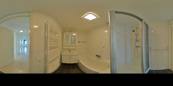 Dan stappen we vanuit de hal de badkamer in. De badkamer is voorzien van een douche, een ligbad en een wastafel met mengkraan, met daaronder een wastafelmeubel en daarboven een spiegelkast.
