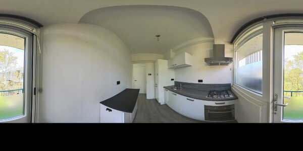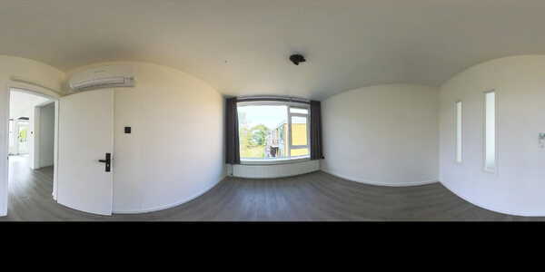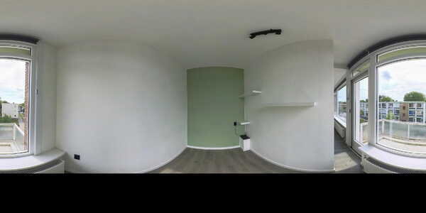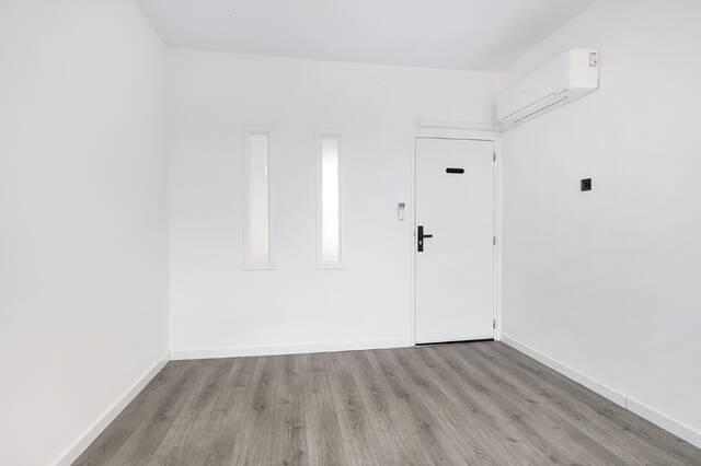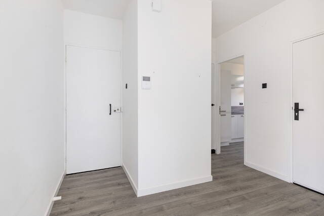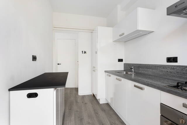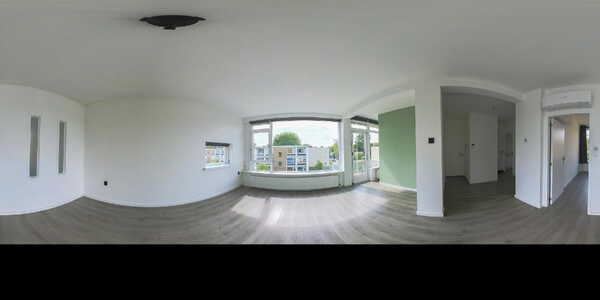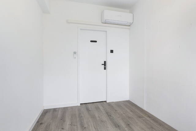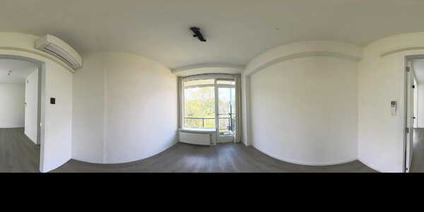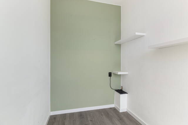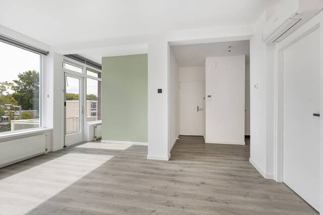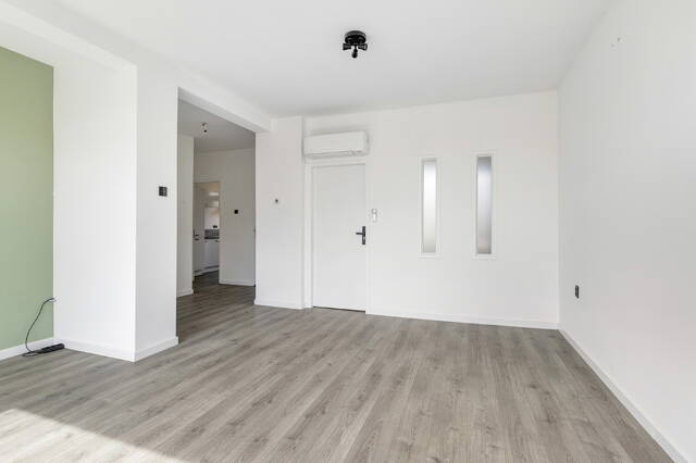 De woonkamer is royaal en profiteert extra van de hoekligging, waardoor er een extra raam aanwezig is. Alle wanden zijn strak gestuukt en wit afgewerkt, met uitzondering van één wand die in een zachte lichtgroene tint is uitgevoerd en de ruimte een warme sfeer geeft. Grenzend aan de woonkamer is een aparte ruimte gecreëerd die momenteel in gebruik is als kantoor. Indien gewenst kan deze eenvoudig worden omgebouwd tot een derde slaapkamer. Over de volledige breedte aan de voorzijde zijn ramen geplaatst en heeft u toegang tot het eerste balkon. Dit diepe balkon ligt gunstig op het zuiden en biedt een heerlijke plek om te genieten van de zon. De woonkamer beschikt daarnaast over een airco die zowel kan koelen als verwarmen.