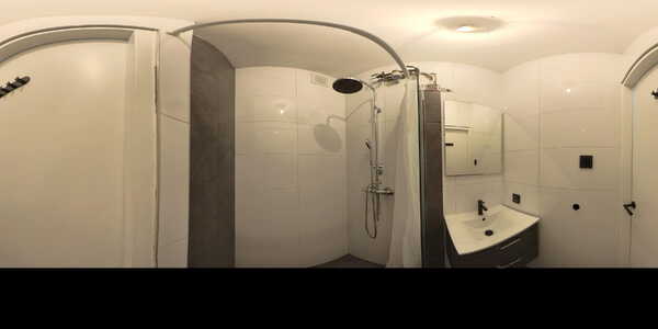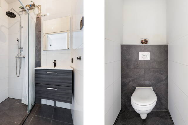 De badkamer is uitgevoerd in een frisse, moderne stijl en voorzien van een inloopdouche en wastafelmeubel met antracietkleurige lades. De wanden zijn betegeld met witte tegels en de vloer met antracietkleurige tegels, wat zorgt voor een strak geheel. Het separate toilet is in dezelfde stijl uitgevoerd en beschikt over een zwevend closet.
