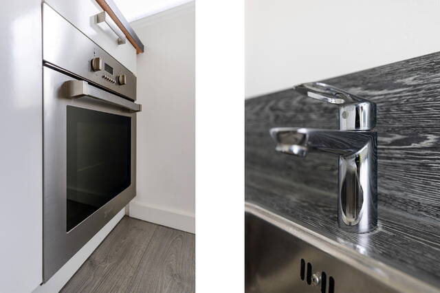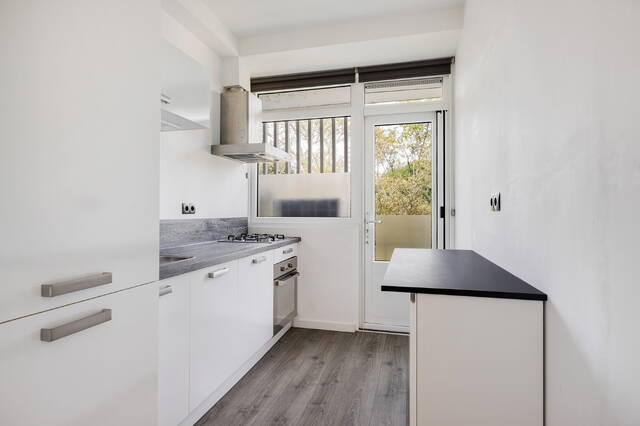 De keuken is modern en praktisch ingericht, met witte kasten, een grijs houtlook aanrechtblad en voldoende opbergruimte. U beschikt hier over diverse inbouwapparatuur, waaronder een 4-pits gaskookplaat, RVS-afzuigkap, koel-/vriescombinatie, oven en vaatwasser.