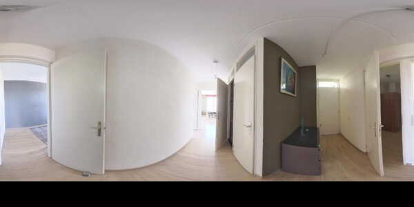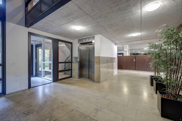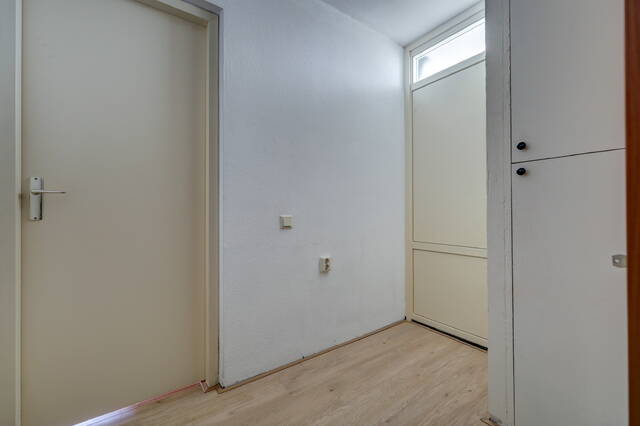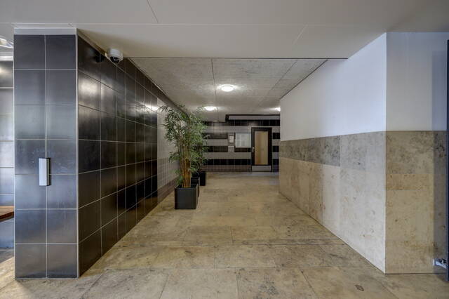Op de begane grond stap je binnen in het afgesloten portiek met bellentableau en brievenbussen. Hier bevinden zich ook de entree naar de bergingen, het trappenhuis en de liftinstallatie. Op de zevende verdieping stappen we de lift uit en lopen naar het einde van de hal, waar we achter de voordeur van het appartement de hal binnenstappen. Daar is voldoende ruimte om de jassen op te hangen en vind je de meterkast.