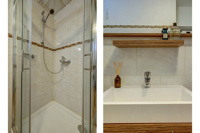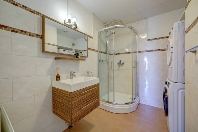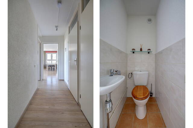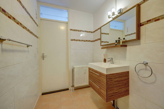 Vanuit de hal heb je toegang tot twee slaapkamers, waarvan de hoofdslaapkamer met ca. 15 m² heerlijk ruim is. De tweede slaapkamer van ca. 12 m² is goed in te delen als logeer-, kinder- of werkkamer. De badkamer is netjes en compleet, met douchecabine, wastafelmeubel en aansluiting voor wasmachine en droger. Het toilet met fonteintje is separaat.